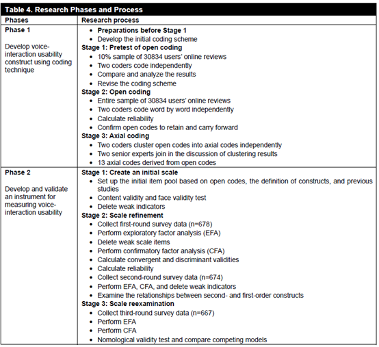 为解决这些问题,论文采用混合研究方法,结合定性分析与定量验证。研究首先通过扎根理论对30,834条用户评论进行编码,识别出语音交互可用性的关键维度;随后基于合作原则理论(CPT)扩展理论框架,增加拟人化维度,并通过三轮近2000份问卷调查开发并验证量表。研究不仅填补了理论空白,还为智能产品的设计优化提供了实践指导。
