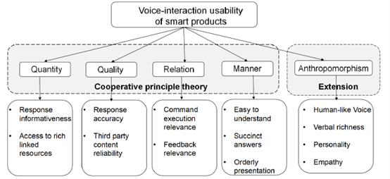 研究对语音交互可用性维度体系的构建,发展了人机交互情境下的会话合作原则理论:用户与智能产品要实现有效的语音交互,需要满足包含数量、质量、关联性、方式与拟人性等五项原则,每项原则又分别含有2到4个子原则维度。如图1所示。