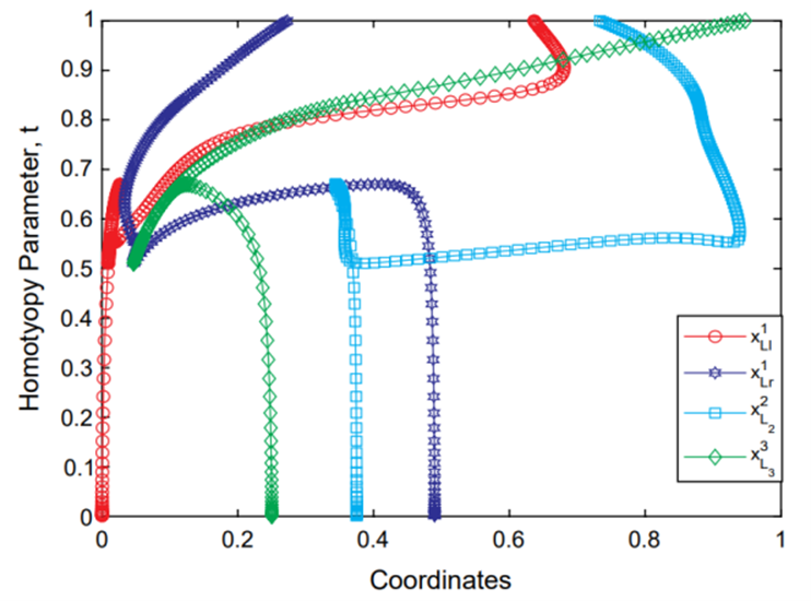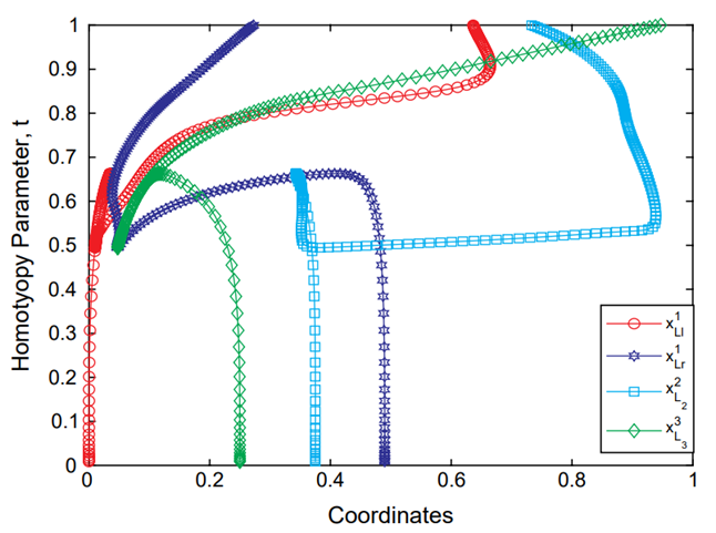 该研究更进一步的突破来自概念层面的创新。文章提出了“完美d-适当均衡”这一新概念,通过引入调节参数d,在保持均衡适当性的同时,显著降低了计算精度的要求。理论证明,当d趋近于零时,新概念会收敛到传统适当均衡;而实际计算表明,即使d取值较大(如1/5),仍能得到令人满意的结果。文章进一步提出了一种计算完美d-适当均衡的可微同伦方法。令d=1/5,应用该方法求解前述左图中的正则式博弈,得到下图所示的光滑路径。当参数t趋近于0时,该路径收敛所得到的解集不仅构成一个完美d-适当均衡,而且与上文求得的适当均衡完全一致。