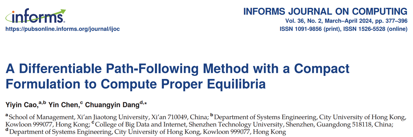 曹译尹助理教授联合深圳技术大学陈寅副教授、香港城市大学党创寅教授开展研究提出了一套系统性的解决方案,并以“A Differentiable Path-Following Method with a Compact Formulation to Compute Proper Equilibria”为题发表将研究成果发表在国际期刊《INFORMS JOURNAL ON COMPUTING》 (UTD 24 期刊)上 。该研究提出了一种可微路径跟随方法,结合紧凑公式化表达,来高效计算正则式博弈中的适当均衡。