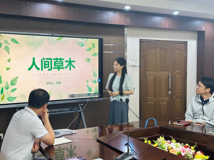 表彰环节结束后,会议进入了书香四溢的读书分享时刻。张莉同志分享了《人间草木》的读书感悟。她从作者汪曾祺的生平介绍入手,详细阐述了书籍的主要内容。书中细腻的笔触描绘了世间草木虫鸟、平凡人事、美食美景,字里行间满是对生活的热爱。张莉同志深入解读书中的精彩片段,她说道:“在这本书中,我们看到了生活的美好,也学到了豁达开朗的生活态度。希望全体同志们都能从平凡与细碎的生活中发现美好,以积极乐观的心态面对工作和生活中的挑战。
