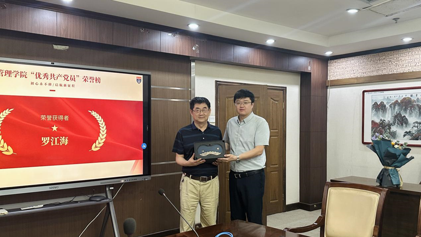 党委书记马晓彬为罗江海同志颁发荣誉证书。他表示:“罗江海同志在工作生活中为人谦和,在平凡的岗位上书写了不平凡的篇章。他的坚守与担当,是我们每个人学习的典范。希望大家立足本职、担当作为,为学院高质量发展贡献自己的力量,让党旗在学院的各项工作中高高飘扬。”
