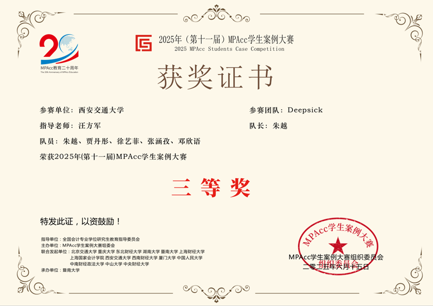 MPAcc学生案例大赛是由14家培养单位联合发起组织的公益性赛事,是会计专业学位培养领域的最高级别赛事。大赛通过组织MPAcc学员亲历企业实践、模拟管理决策、比拼解决方案,培养并提升MPAcc学员发现、分析、解决企业实际问题的能力,是MPAcc学员展示自身的舞台与个人成长的助推器。第十一届MPAcc学生案例大赛自2025年3月份启动,共有来自东北、华北、华东、华中、华南、西南、西北七个赛区300余所高校的3173支MPAcc团队和307支本科生团队报名参赛。经过初赛第一阶段及第二阶段为期三个月的激烈角逐,西安交大代表队凭借扎实的专业功底、出色的案例分析能力和高度凝聚的团队协作精神,以优异成绩成功晋级全国前三十强。