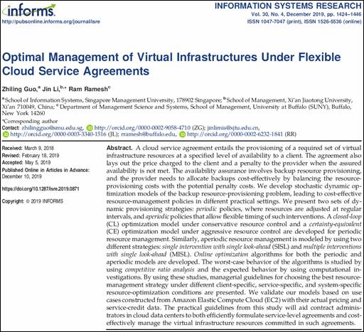 该研究成果以《灵活云服务协议下虚拟基础设施的优化管理》(Optimal Management of Virtual Infrastructures Under Flexible Cloud Service Agreements)为题发展在《信息系统研究》(Information Systems Research)期刊上。文章核心结论不仅适用于基础架构即服务(IaaS)模式,也可很容易地拓展应用到平台即服务(PaaS)模式。这项研究成果有益于云数据中心优化服务协议,经济高效地管理虚拟计算资源,对下一代云技术发展和绿色云数据中心的建设具有重要意义。