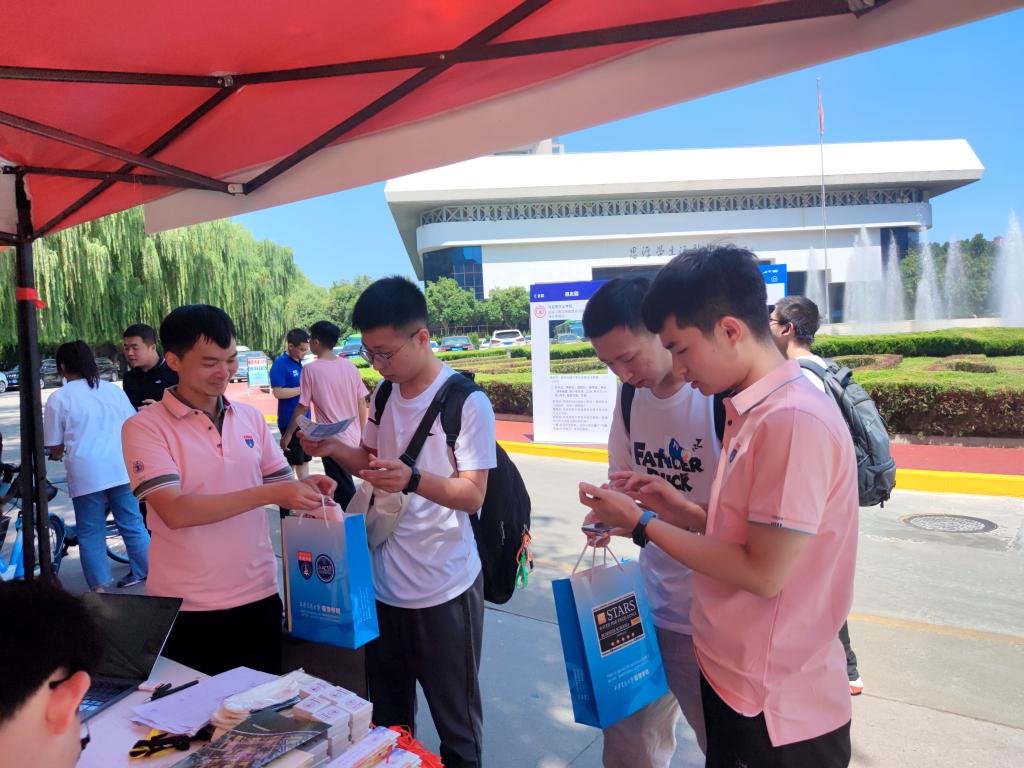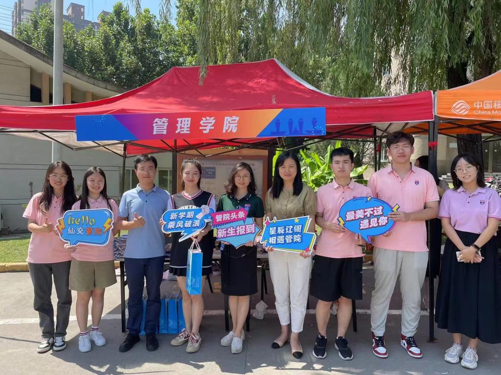 迎新点,9名星航班学员身着管院院服,在学院老师的指导和带领下,全身心投入迎新工作,他们井然有序地引导新生报到、发放大礼包、协助拍照打卡,为同学们记录下成长路上这一特殊时刻。
