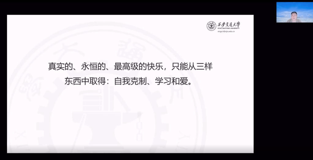 最后,班主任李星老师通过讲述交大西迁的历史,分享自己在求学阶段的故事,向大家阐述了自己对快乐的见解,即爱、学习和自我克制。李老师告诉同学们,不论眼下的生活如何,在未来都将成为宝贵回忆中的一部分。他勉励大家面对疫情不灰心不丧气,保持不竭的学习动力和乐观向上的精神态度。