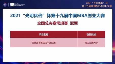 代表队凭借《硅基光子集成技术及应用》项目一举夺魁,获得本届中国MBA创业大赛全国总决赛常规赛冠军,创造了我校在该项赛事中的最好成绩!