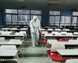 为做好疫情防控,院办安排物业人员定时给各办公室和楼内公共区域进行喷洒消毒,切实保障师生的生命健康。