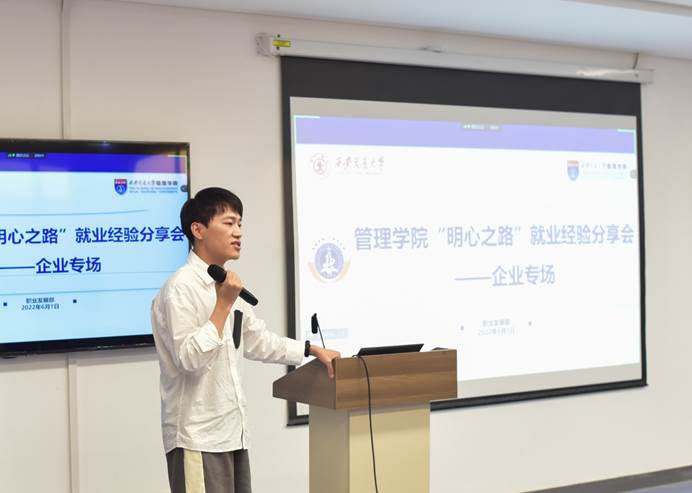 2022届毕业生刘楚(华为供应链管理岗),贾梦超(中信建投证券),张为栋(工商银行总行),杨沛森(中国农业发展银行陕西分行),武子云(百度),张晓磊(腾讯)等同学,为低年底同学分享了职业规划和求职方面的知识和经验。活动现场座无虚席,气氛热烈,极大程度上解决了同学们当前的求职困惑。自拍偷拍