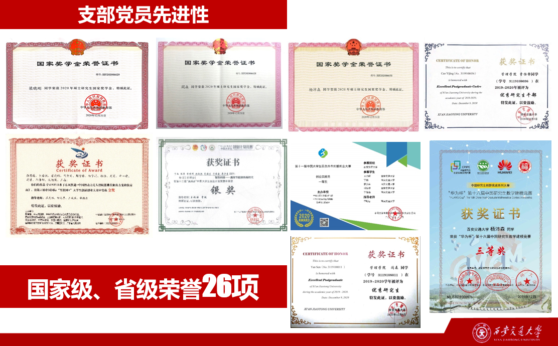 愿为鸿鹄志,奋翅展高飞。习近平总书记曾说:“青年是苦练本领、增长才干的黄金时期”。学史力行,创先争优,支部党员用实际行动赓续红色青春的革命血脉。支部党员杨沛森获评优秀研究生标兵,梁晓刚、阎森荣获研究生国家奖学金。1人推荐评为校优秀共产党员,15人获评优秀研究生或研究生干部,3人获得创新港青年先锋突击队队员称号,共获得国家级、省级荣誉26项,得到了校内外知名媒体的宣传报道。支委牵头编撰的优秀党员事迹册广受好评,为学院首创。