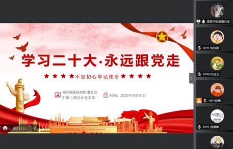 2021级工商会计硕士党支部联合硕1090团支部、硕1091团支部举办了“学习二十大,永远跟党走”主题教育活动。共有49位同学通过腾讯会议线上参加本次活动,认真学习党的二十大精神。