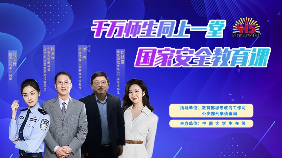本次公开课由北京师范大学2019级本科生刘懿莹主持,中南大学辅导员、2019年全国最美高校辅导员张金学,国家反诈中心民警刘明竹和中国传媒大学新闻学院教授沈浩三位业内专家参与讲授。公开课介绍了总体国家安全观相关内容,讲述了为什么国家安全与我们息息相关,还介绍了新时代国家安全的丰富内涵。
