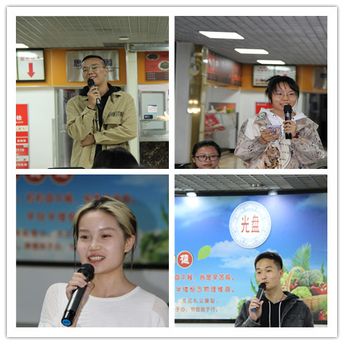 饮食服务中心党支部副书记谭宏彦为大家介绍了学校食堂几年来开展光盘节粮工作和完善沟通机制的情况。结合传统文化和大学生就餐现状,她号召同学们进一步增强节粮意识,从自身做起,从小事做起,为节粮贡献每个人的力量。崇实书院辅导员薛成老师强调了此次活动的意义,他希望同学们在思想上要认识到粮食安全的重要性,在行动上要节约粮食并积极参与文明餐桌志愿活动。