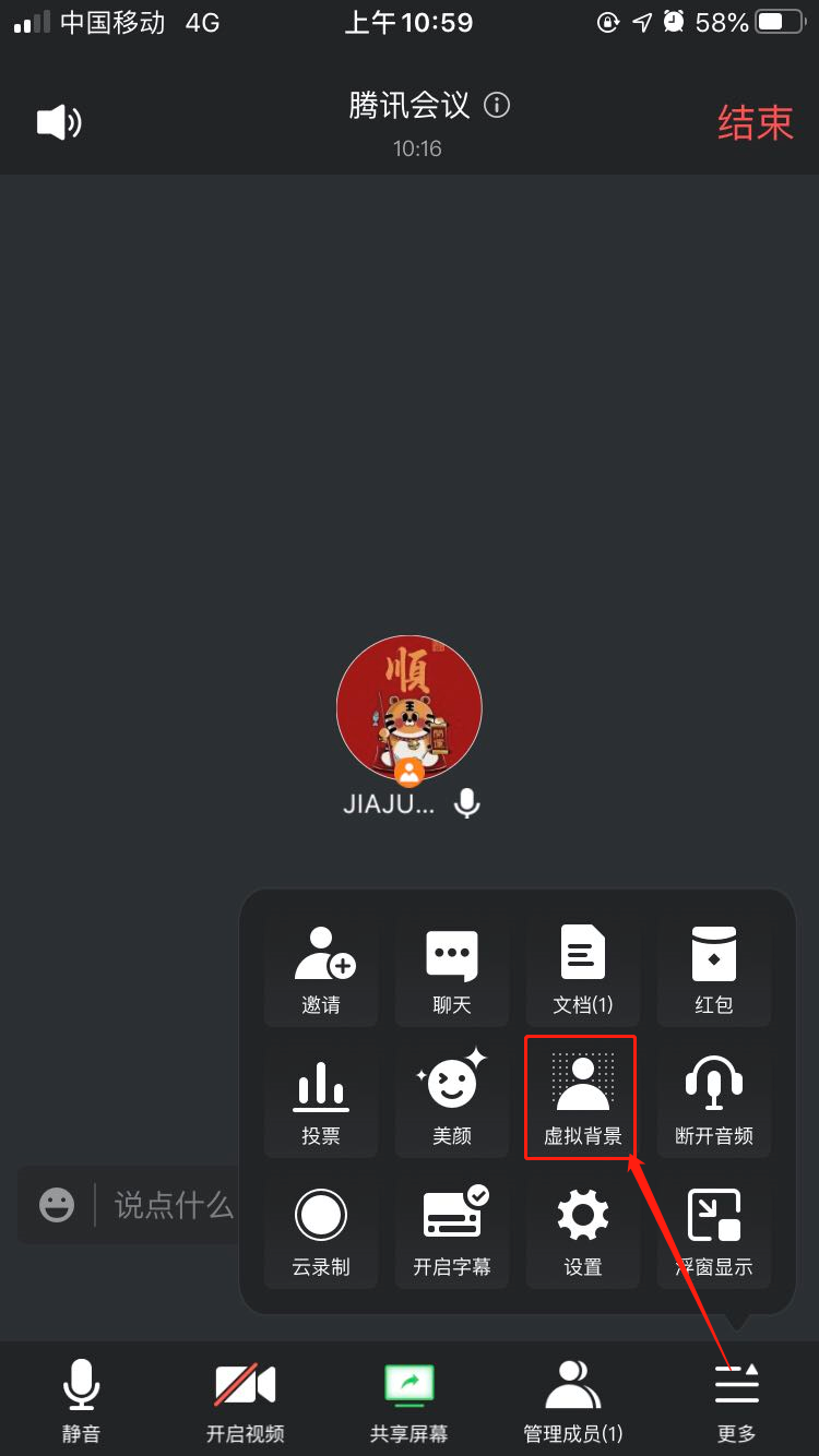 2、使用手机参会时,点击系统右下方“更多”中的“虚拟背景”,关闭右上方的“镜像”开关,然后选择自己心仪的图片即可。