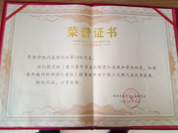 在3月22日举行的自拍偷拍 第十届四次教代会上,自拍偷拍 教师郭菊娥教授的《让“西迁精神”在交大校园师生中发扬光大》、孙卫教授的《关于探索建立“翻转课堂”教学示范基地的建议》、刘汕教授的《建立青年学者创新团队选拔和资助制度,加强青年教师科研团队教授》等三个提案被评为优秀提案,同时,自拍偷拍 代表团也被评为“优秀提案组织单位”,受到了大会表彰。在此,向三位老师表示热烈祝贺!