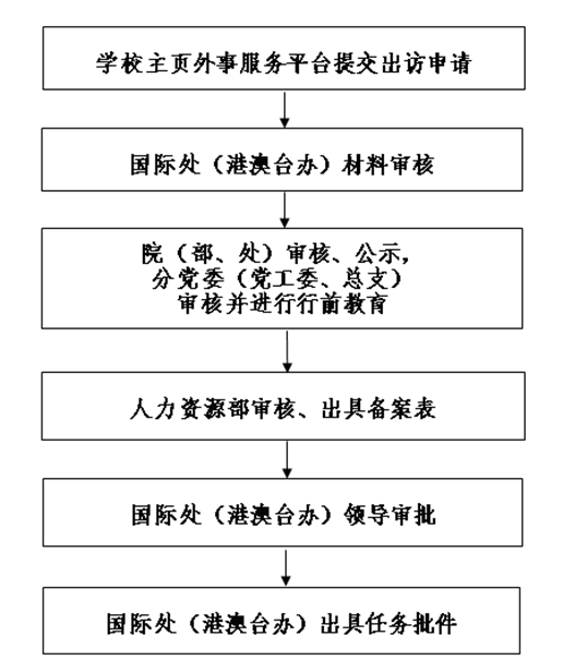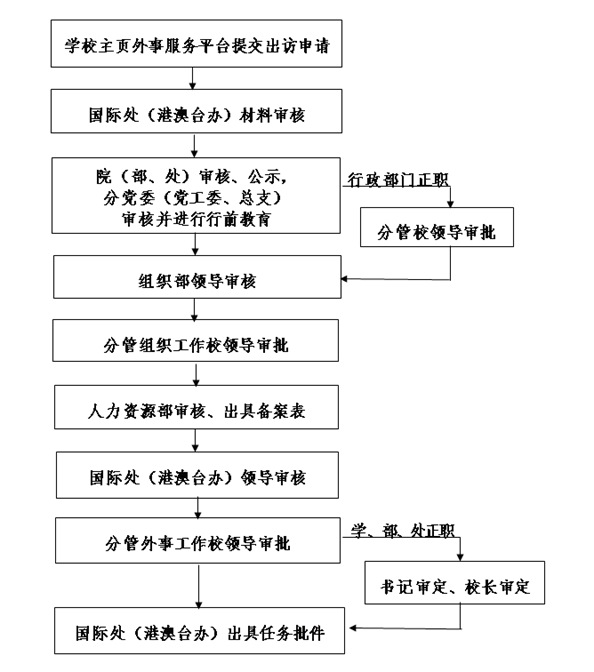 根据教育部严格规范领导干部出访文件的相关规定,各级领导应邀出访应有目的性、计划性和实质性内容,避免无实质内容的考察和出访。为此,结合我校因公出国(境)管理规定,制定了副校级以上领导干部的出访审批流程。