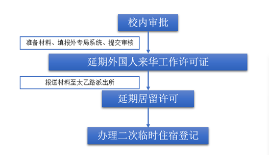 1.办理《外国人来华工作许可证》延期须在卡证到期日前3个月与国际处项目办取得联系。