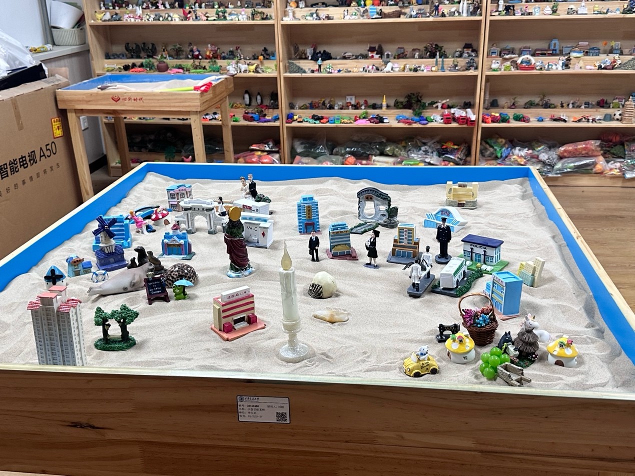随后,闫老师让同学们按顺序依次往沙盘上摆放沙具。同学们纷纷挑选自己喜欢的沙具,小心翼翼地将它们放置在沙盘上。有的同学摆放了可爱的小动物,有的同学则选择了高楼大厦。在摆放过程中,同学们都非常专注,仿佛在构建一个属于自己的心灵世界。当所有同学都放置完毕后,沙盘呈现出了一幅丰富多彩的画面。