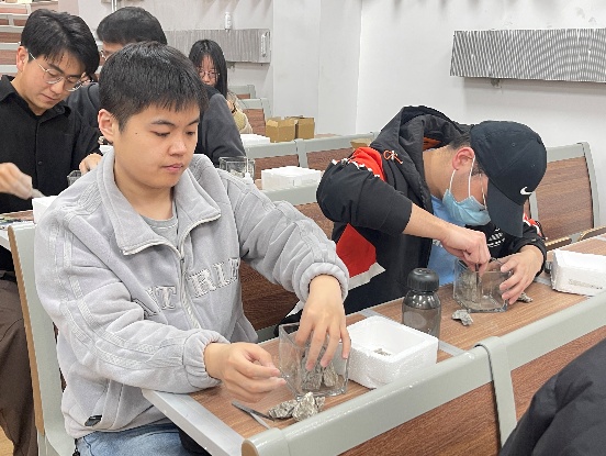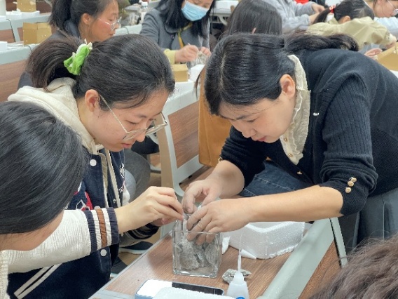 在实践环节,教师从选材、布局、涂胶到植物移栽进行了全程示范,并手把手地指导学生操作。同学们在老师的悉心指导下,认真完成每道工序。在选材环节,同学们精心挑选着每一块山石、每一株植物,试图在方寸之间营造出自然的韵味。布局时,他们反复推敲山石的位置、植物的摆放,力求达到最佳的视觉效果。通过山石布局、涂胶、植物移栽等实践操作,同学们切身体验了劳动创造美的全过程。