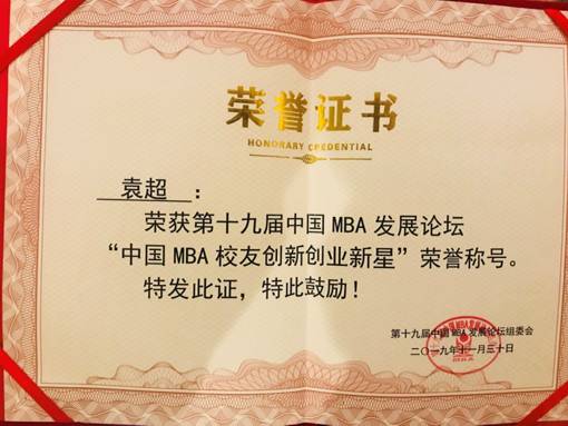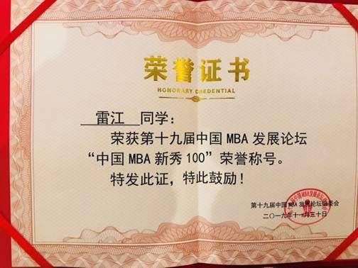 我校袁超同学获得“中国MBA校友创新创业新星”荣誉称号,肯定了袁超同学在创新创业方面取得的成绩和未来发展的潜力。我校雷江同学获得“中国MBA新秀100”荣誉称号,肯定了雷江同学具有创新能力、潜质非凡。